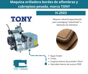 El H2502 / H2503 es un de alfombras resistente que es capaz de coser alfombras gruesas. El sistema de lubricación automático permite que la máquina funcione a altas velocidades durante largos períodos de tiempo con un desgaste y calor mínimos. Máquina de 3 hilos